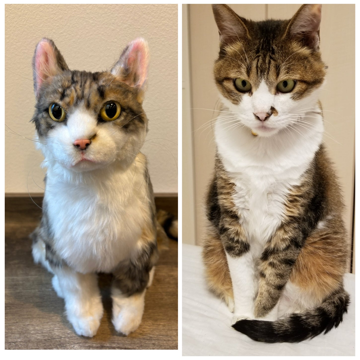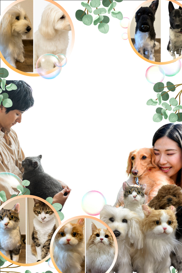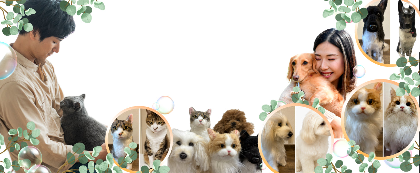 いくつかの角度から撮影したペットの写真をもとに、毛色や模様、瞳の色、体の丸み、姿勢などをできる限りそのまま再現して制作する世界にひとつだけのオリジナるのぬいぐるみです。