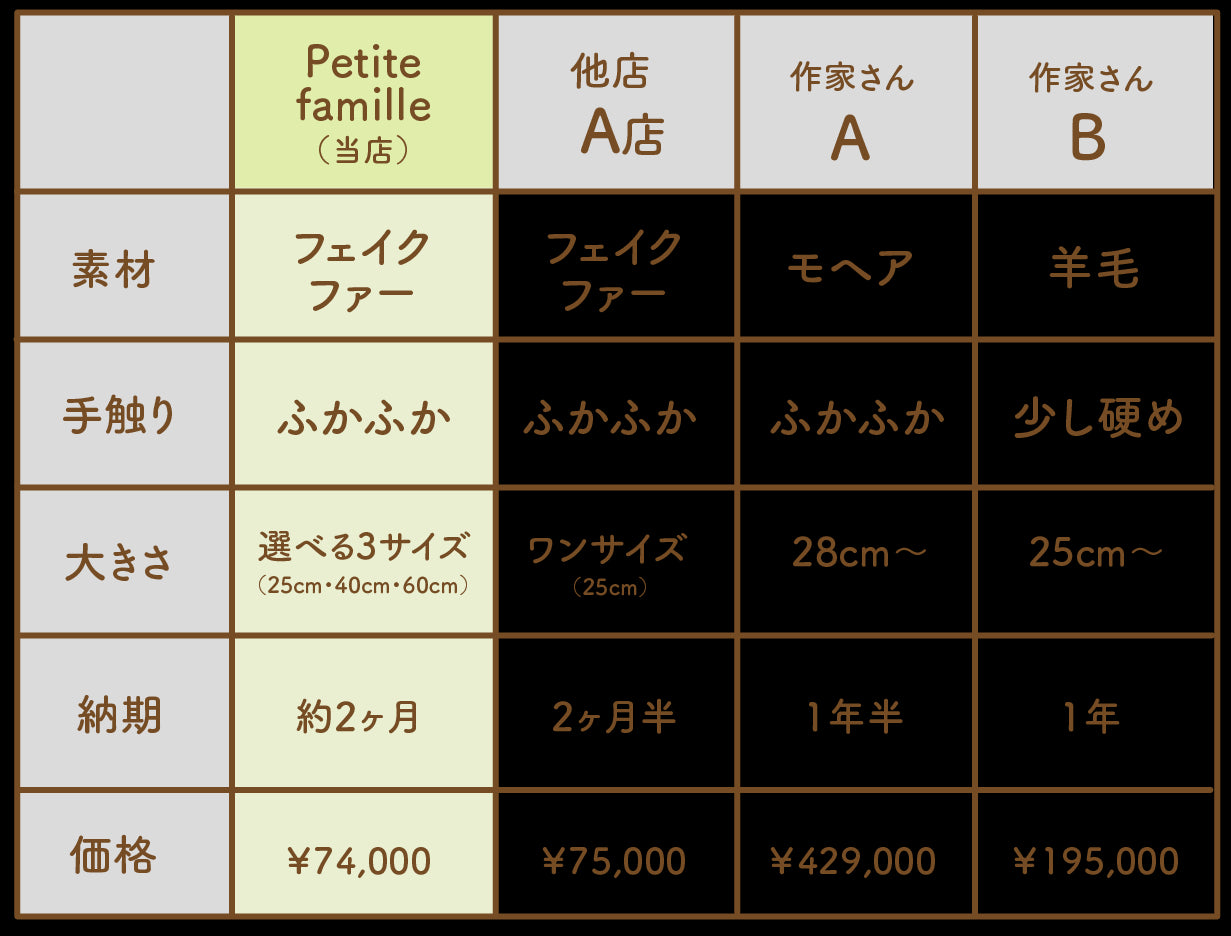 サービス内容をほかのオーダーメイド店とくらべてみました。当店では、実際のペットに近いサイズを3パターンからお選びいただくことができ、よりペットに近い大きさもそっくりなぬいぐるみをお届けできます。